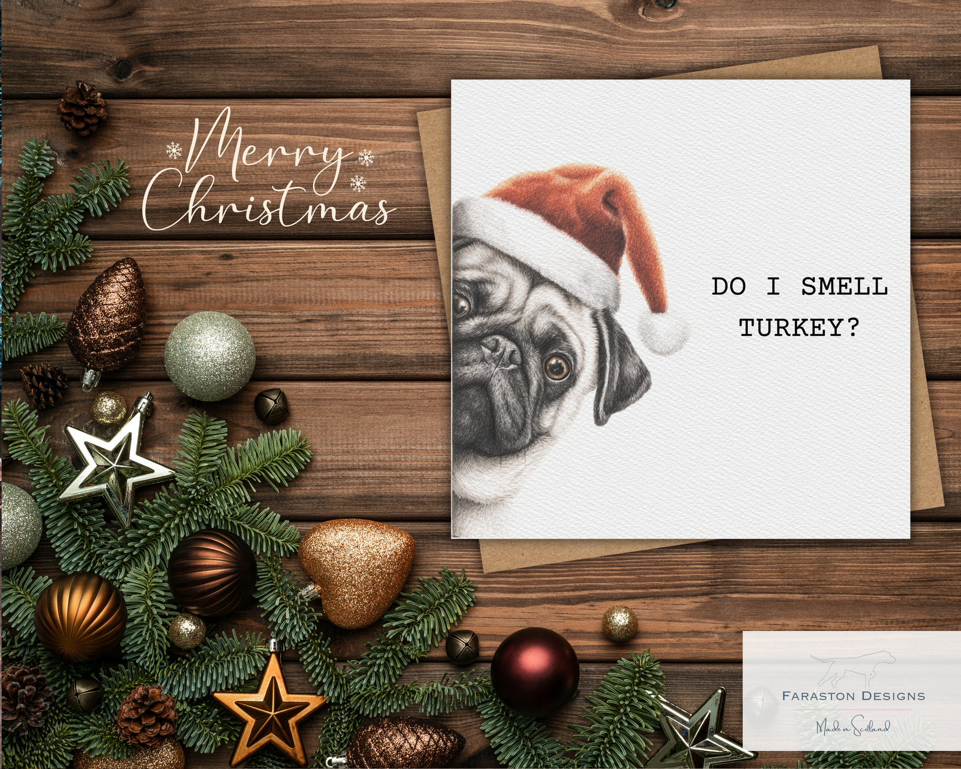 This festive card is guaranteed to raise a smile. Featuring a beautifully illustrated Pug in a Santa hat with the words “Do I Smell Turkey?”, it’s the perfect way to send a touch of humour and charm this Christmas.