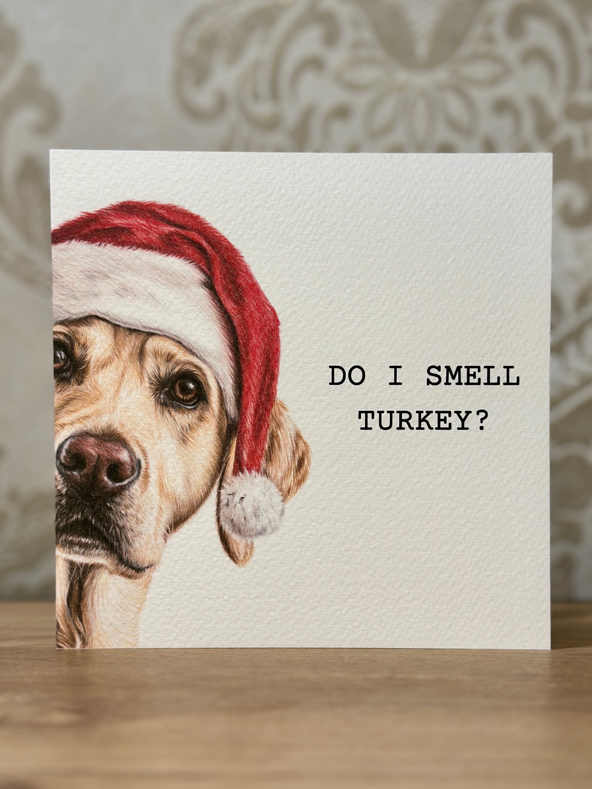 This festive card is guaranteed to raise a smile. Featuring a beautifully illustrated yellow Labrador in a Santa hat with the words “Do I Smell Turkey?”, it’s the perfect way to send a touch of humour and charm this Christmas.