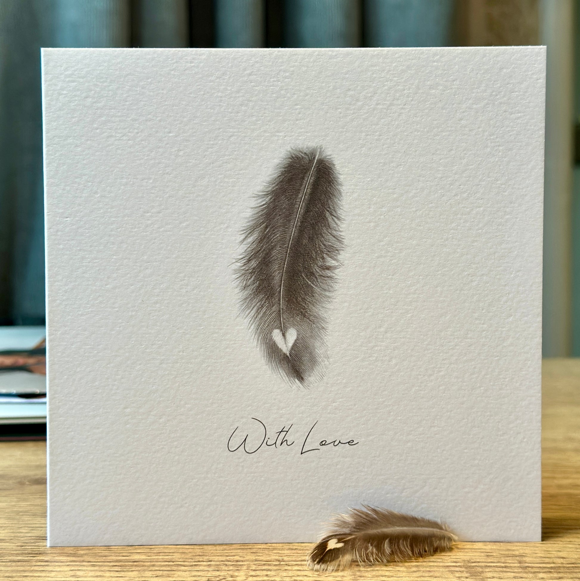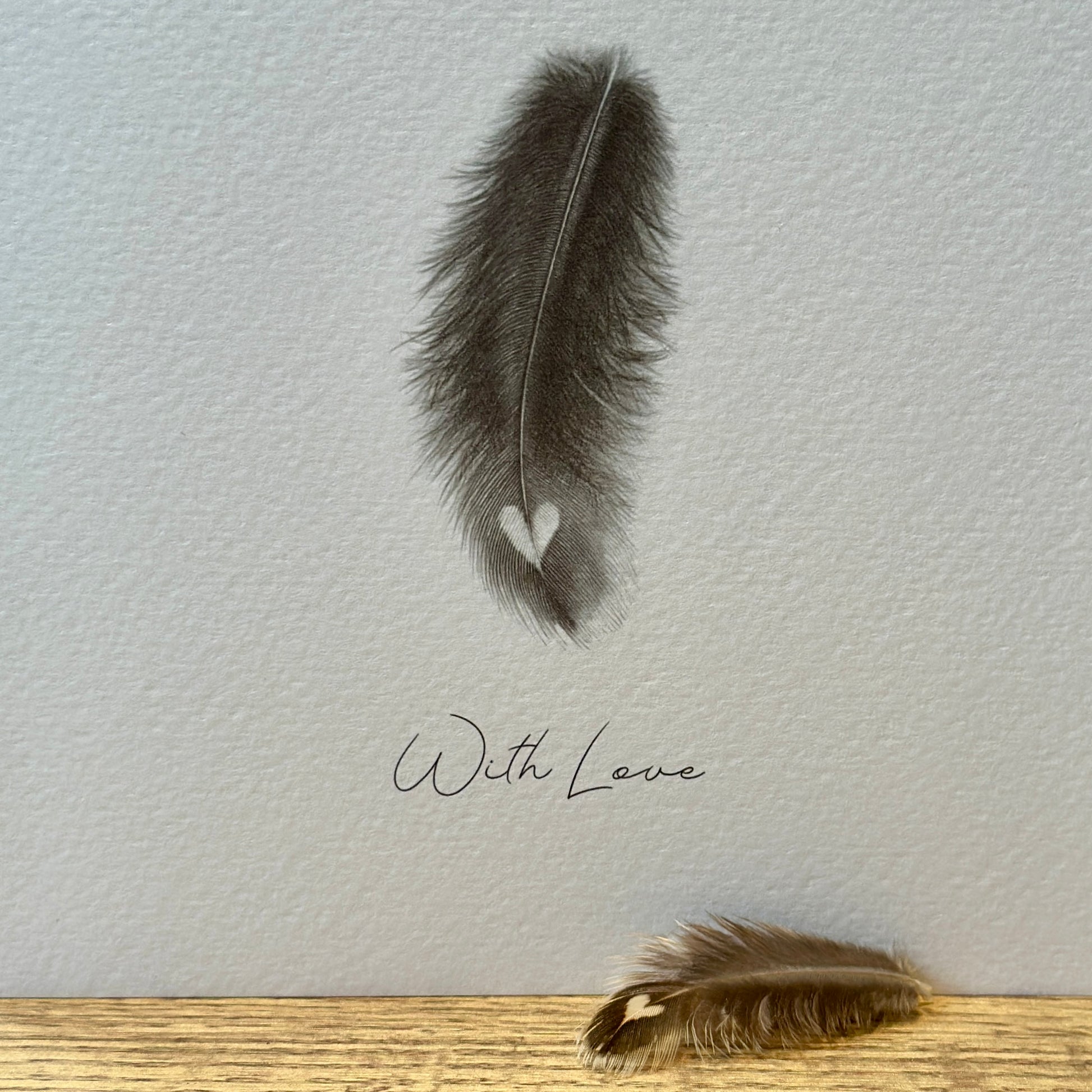 This unique design features a finely detailed illustration of the actual feather, complete with its naturally heart-shaped marking, making it a gentle, heartfelt way to send love, comfort, or care.