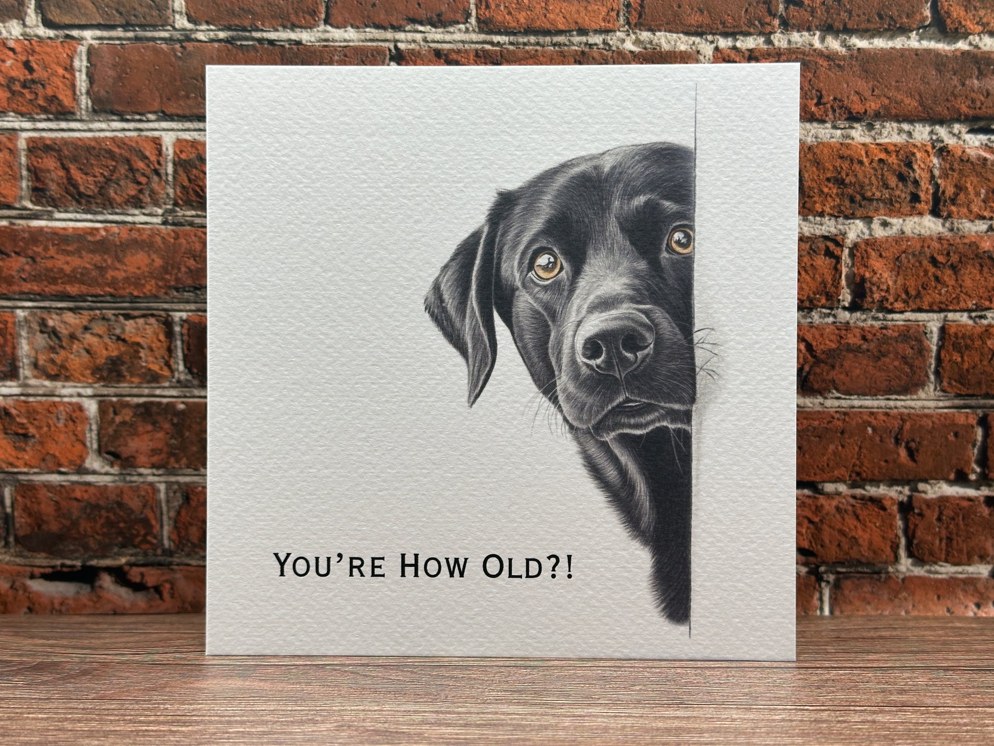 This wonderful illustration captures that distinct Black Labrador personality—inquisitive, expressive, and always wanting to be involved. With wide, amber eyes and a hilarious peeking pose, this dog seems just as surprised by the birthday number as everyone else. A witty and high-quality card that is sure to get a laugh.
